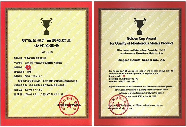 2019年10月至12月,中國有色金屬工業協會專家委員會對青島宏泰銅業有限公司申報的空調與制冷設備用銅及銅合金無縫管進行實地審核和答疑。經專家委員會審核認定:青島宏泰銅業有限公司申報的空調與制冷設備用銅及銅合金無縫管的實物質量達到了國際同類產品實物質量,特授予有色金屬產品實物質量金杯獎。